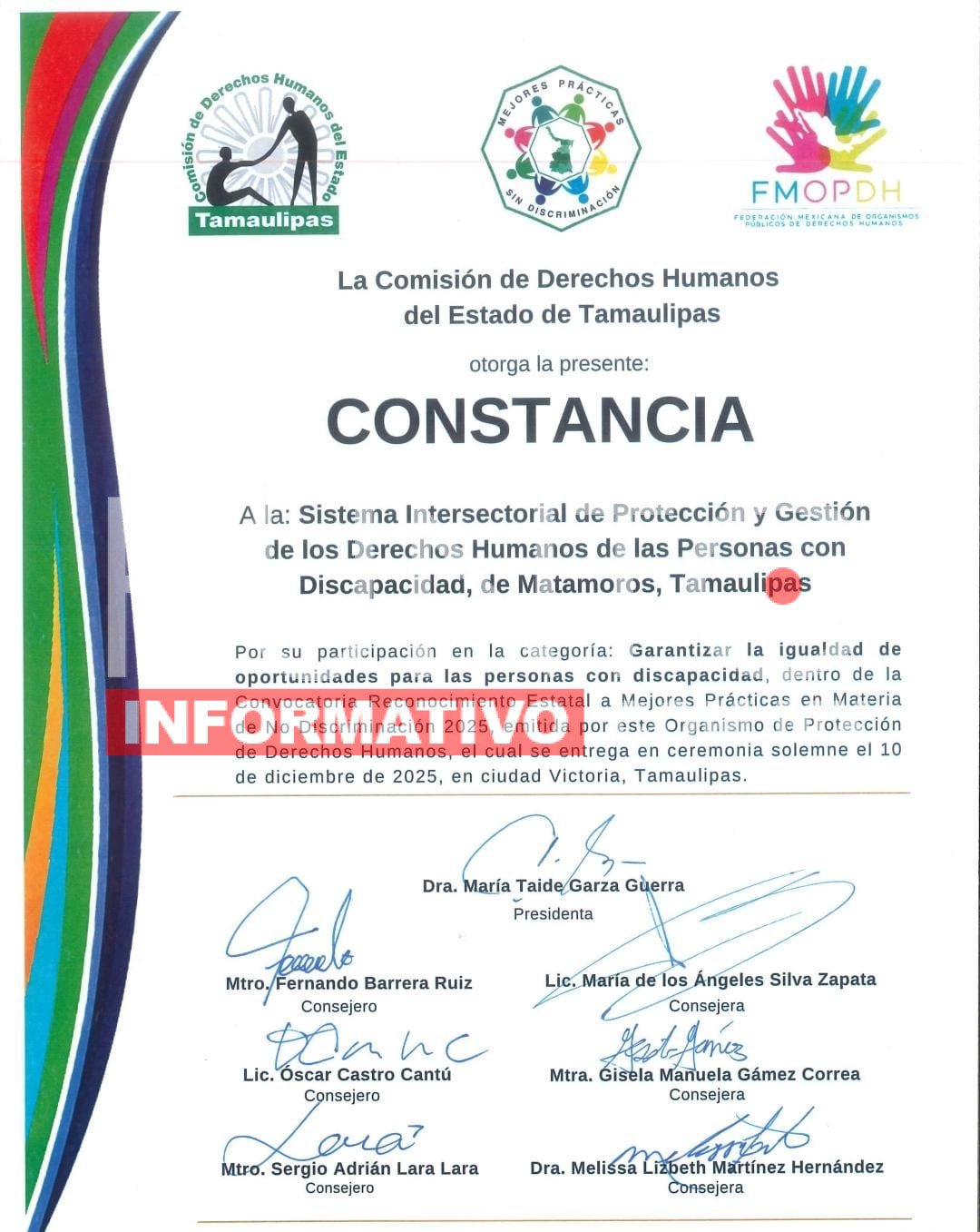 H. Matamoros, Tamaulipas.- El Gobierno Municipal de Matamoros, encabezado por el alcalde Beto Granados, recibió un reconocimiento estatal por parte de la Comisión de Derechos Humanos del Estado de Tamaulipas, por las acciones encaminadas a garantizar la igualdad de oportunidades para las personas con discapacidad.