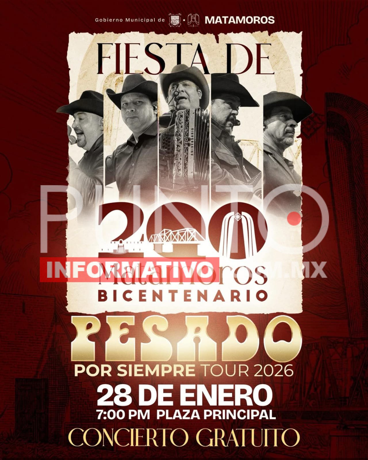 H. Matamoros, Tamaulipas.- En el marco de la celebración del Bicentenario de Matamoros, el alcalde Beto Granados destacó que la llegada de la reconocida agrupación Pesado forma parte de las actividades diseñadas para fortalecer la identidad, la convivencia familiar y la solidaridad entre las y los matamorenses.