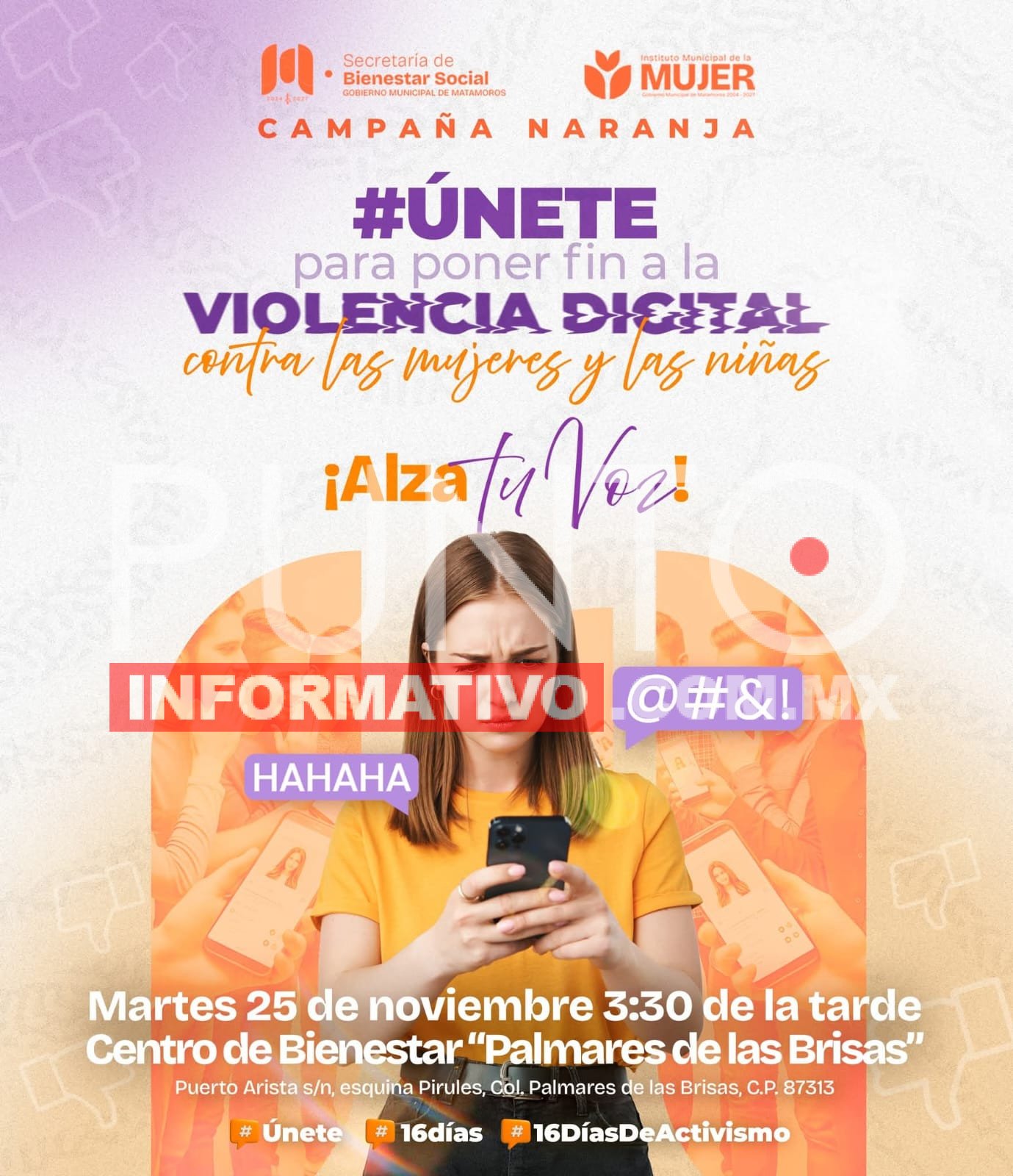 Matamoros, Tam.- El Gobierno Municipal que encabeza Beto Granados invita a la ciudadanía a participar en la Campaña Naranja “ÚNETE para poner fin a la violencia digital contra las mujeres y las niñas”, una jornada dedicada a la prevención, reflexión y concientización sobre las agresiones que afectan a mujeres y niñas en entornos digitales.