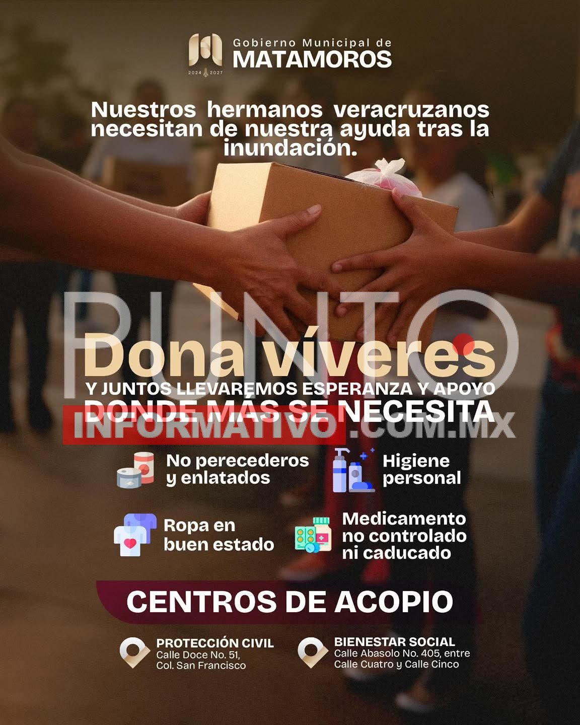 Se invita a todos los matamorenses a donar víveres, ropa en buen estado, artículos de higiene personal y medicamentos (no controlados ni caducados).